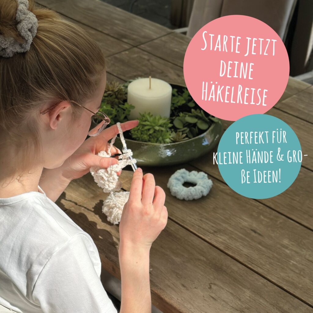 Ab sofort gibt es bei Häkel-Liese ein ganz besonderes Set für die Kleinen: unser Häkelset für Kinder – Scrunchies.